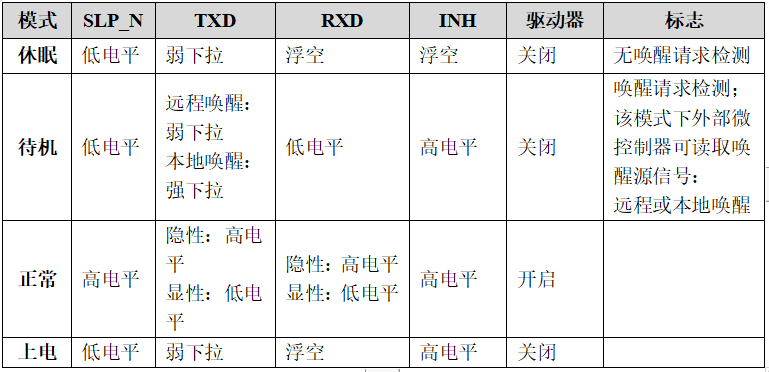SIT1021工作在各模式下,相關(guān)引腳狀態(tài)如下表: