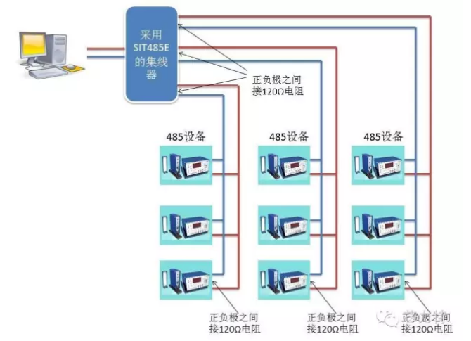 采用星形結(jié)構(gòu)的RS485總線拓?fù)淙鐖D3所示,這種結(jié)構(gòu)要注意在集線器的每一對(duì)458+,485-端口加120Ω的終端匹配電阻。